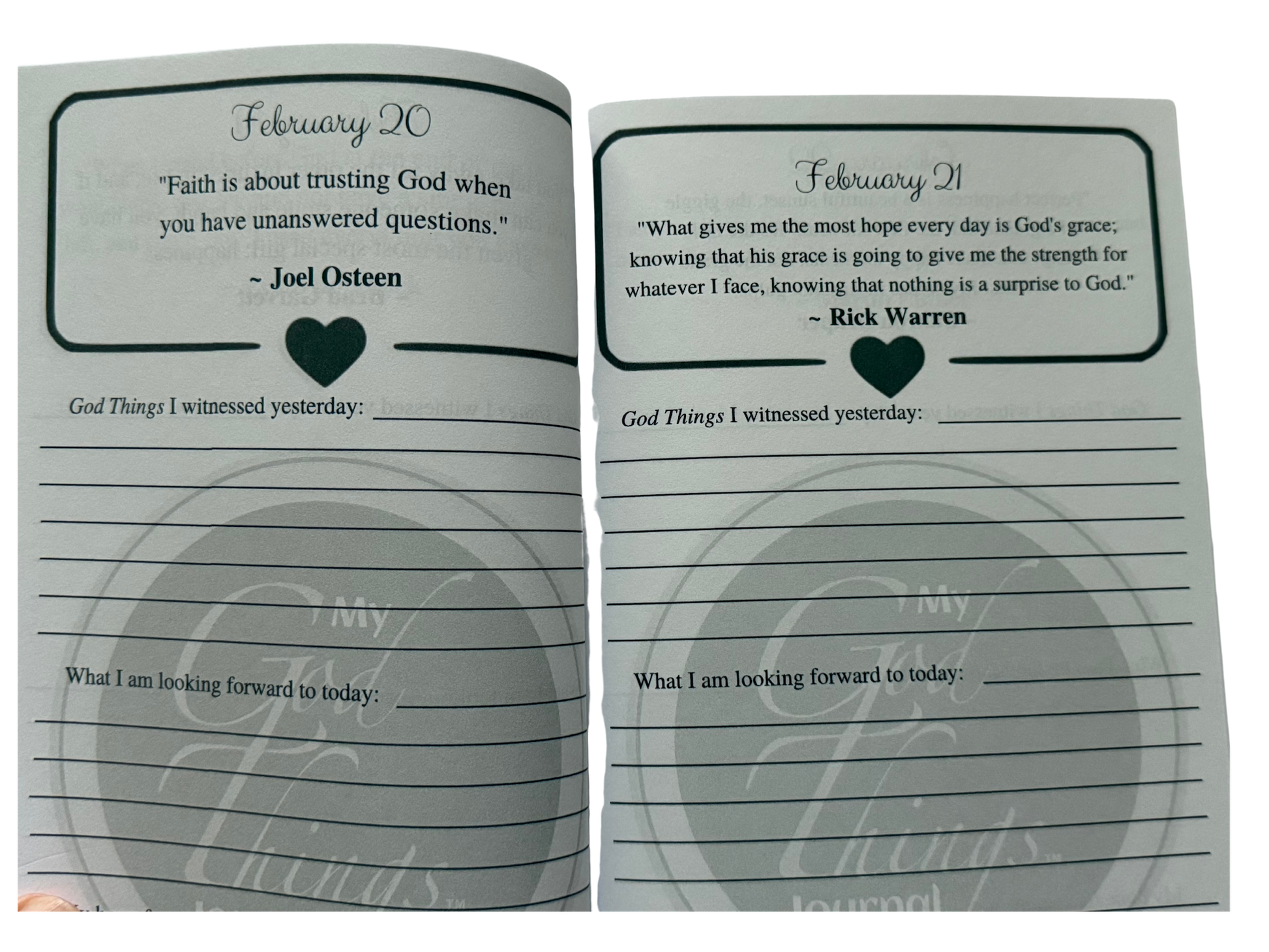 The My God Things Journal is a daily reflection journal created to help you recognize and record the blessings God places in your life each day. Inspired by the truth that we are made in His image, this journal celebrates the beautiful thoughts, creativity, and wisdom that God has placed within men and women.
